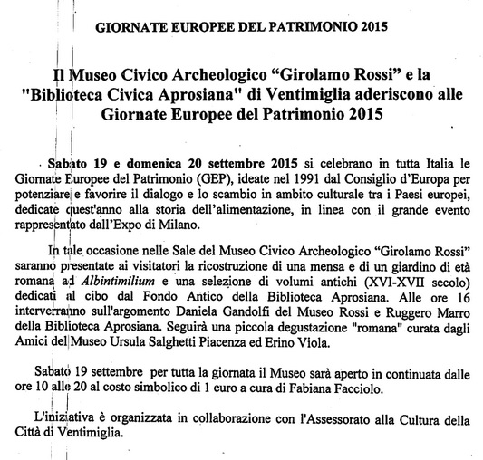 VENTIMIGLIA 19-20 SETTEMBRE GIORNATE EUROPEE DEL PATRIMONIO