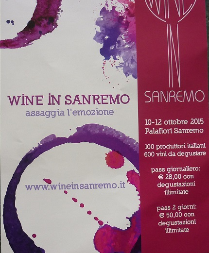 Al PALAFIORI in centro a Sanremo dal 10 al 12 ottobre 2015 scatta la prima edizione di ” Wine in Sanremo” , l’evento porterà in città un centinaio di produttori italiani e circa 600 vini in degustazione per conoscere meglio conoscere le etichette storiche e le zone vinicole ancora da scoprire.