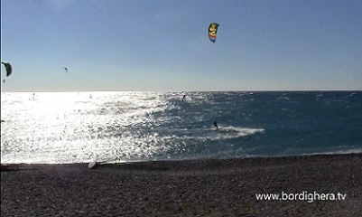 Sabato  31 ottobre 2015 sulle acque antistanti il Lungomare Argentina (Capo Sant’Ampelio) di Bordighera alcuni sportivi che praticano il  Windsurf e Kitesurf , approfittano delle  giornate ventose favorevoli come quella di oggi  per cimentarsi in questo genere di  sport.