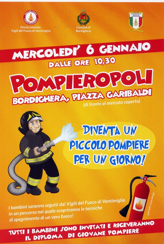 Mercoledì 6 gennaio 2016 alle ore 10:30 a Bordighera arriva la prima edizione di “POMPIEROPOLI” in Piazza Garibaldi organizzata dal Comune di Bordighera in collaborazione con il distaccamento Vigili del Fuoco di Ventimiglia.