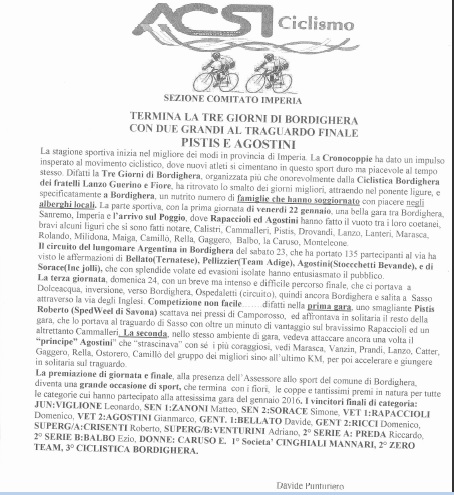 Bordighera Sport CICLISMO “LA TRE GIORNI DI BORDIGHERA” 24 Gennaio 201624 Gennaio 2016 admin Pubblichiamo un comunicato pervenuto da Davide Punturiero
