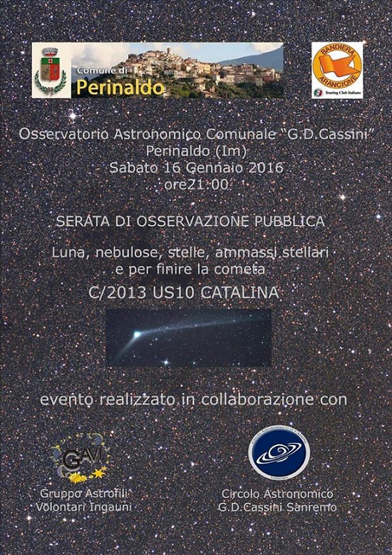 PERINALDO, SABATO 16 GENNAIO LA RIAPERTURA DELL’OSSERVATORIO COMUNALE “G.D. CASSINI” CON UNA NUOVA GESTIONE. Una serata di osservazione di luna, nebulose, stelle e ammassi stellari: protagonista anche la cometa C/2013 US10 Catalina (detta anche cometa di Natale)