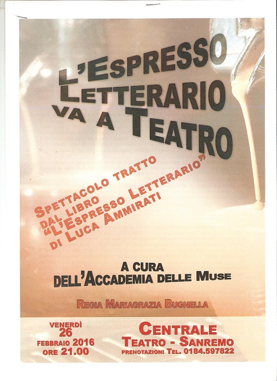L’ Espresso Letterario  di Luca Ammirati  al Teatro Centrale di Sanremo . Venerdì 26 febbraio  va ‘ in scena lo spettacolo tratto dal libro di racconti  dell’autore sanremese inserito  nel novero dei 150  poeti italiani contemporanei dalla Fondazione Mario Luzi di Roma. La trasposizione teatrale del testo è a cura dell’Associazione Culturale Accademia delle Muse di Bordighera. Interpreti Elena Abate, Marta Collu, Liana Iacchi, Pietro Pizzo, Doriana Valesini, Lucia Morlino. Sul palcoscenico , anche Cristina Silvestro, violinista  dell’Orchestra Sinfonica di Sanremo recentemente esibitasi al Festival della Canzone Italiana. Regia di Mariagrazia Bugnella. Luci-audio Stefano Di Luca.