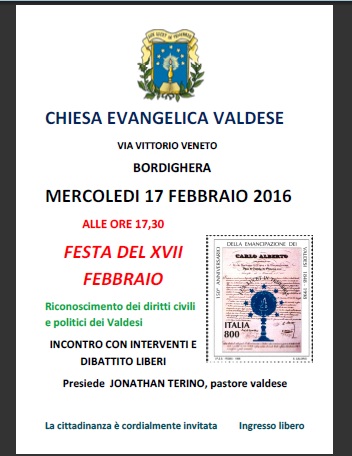 Mercoledì 17 febbraio 2016 alle ore 17:30 il Pastore Valdese Jonathan Terino  presiederà all’incontro e dibattito sul ” Riconoscimento dei diritti civili e politici dei Valdesi.L’ EVENTO  ” FESTA DEL XVII FEBBRAIO ”  è rivolto a tutta la cittadinanza e l’ingresso è libero alla Chiesa Valdese di Bordighera –via Vittorio Veneto.