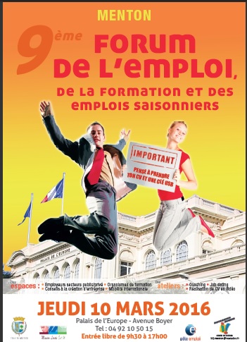 Le jeudi 10 mars, de 9h30 à 17h au palais de l’Europe, le service Jeunesse de la Ville de Menton et les acteurs de l’emploi se mobilisent pour aider les personnes en recherche d’un travail ou d’une formation.