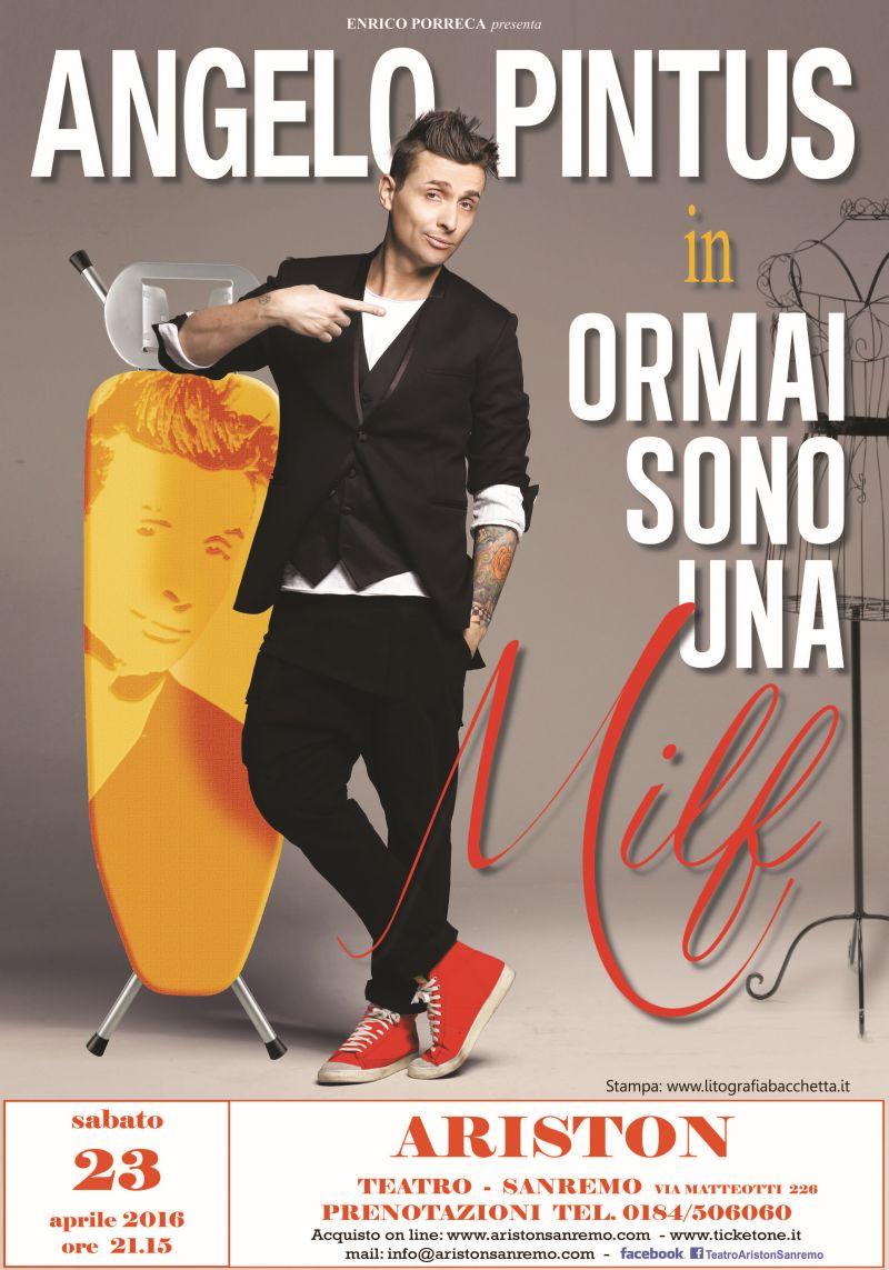 Come cambia la vita a 40 anni? Cambia che non puoi più mangiare quello che mangiavi prima…cambia che sei ancora troppo giovane per fare alcune cose, ma già troppo vecchio per farne altre… La vita a quarant’anni raccontata e vista con gli occhi di chi si sente sempre quel bambino che quando vedeva gli amici quarantenni dei propri genitori li considerava “vecchi” e si meravigliava di quanto vivessero a lungo “i grandi”. E che ora guardandosi allo specchio pensa di essere sempre più in forma, anche se ormai è un uomo fatto. Un uomo? Una signora! Anzi… una milf! “Ormai sono una milf” è il nuovo spettacolo di Angelo Pintus, reduce dal successo di “50 Sfumature di…Pintus“, record di incassi e di presenze in tutt’Italia. Un vero fenomeno che lo ha traghettato direttamente al festival di Sanremo come ospite comico, per un ulteriore bagno di notorietà.