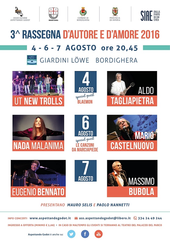 Una manifestazione in netta crescita realizzata dall’associazione ‘Apettando Godot’ con il contributo del comune di Bordighera, il patrocinio di Regione Liguria e Provincia Imperia. In questa edizione 2016 anche il sostegno della Società Italiana degli Autori ed Editori, un riconoscimento significativo per la rassegna “d’Autore e d’Amore”che, con valide credenziali, si presenta come uno tra gli eventi di maggior rilievo dell’Estate nel Ponente Ligure.