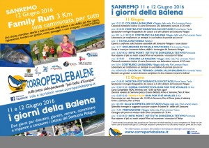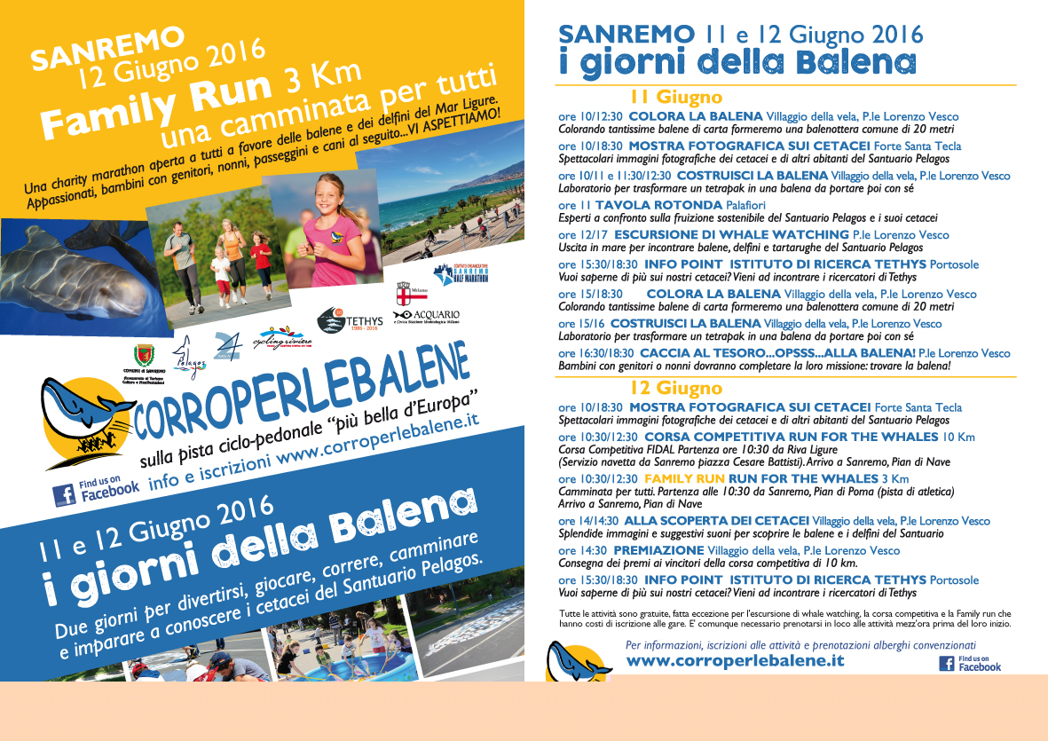 Grazie all’organizzazione tecnica del Comitato Organizzatore Sanremo Marathon, domenica 12 giugno si potrà scegliere di “marciare per le balene” sulla pista ciclo-pedonale più bella d’Europa con due diverse modalità: una corsa competitiva FIDAL di 10 km, dove i podisti provenienti da Italia e Francia correranno da Riva Ligure fino a Sanremo, e una camminata di circa 3 km sul tratto sanremese della pista per bambini, genitori, nonni o per chi semplicemente preferisce un percorso meno impegnativo. Per tutti l’area di arrivo sarà Pian di Nave. I costi di iscrizione sono di € 20 (online fino al 7 giugno, € 25 in loco) per la corsa competitiva FIDAL di 10km e di € 7 (più € 1,5 per diritti di iscrizione) per la camminata di 3 km (gratuito per bambini con meno di 12 anni).
