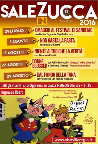 Il comune di Riva Ligure, in collaborazione con la casa editrice Zem, promuove anche quest’anno “Sale in Zucca”, una manifestazione che propone incontri e conversazioni con autori e personaggi, che ci aiutano a conoscere e capire il territorio e la società in cui viviamo.