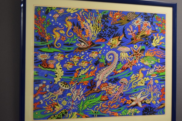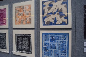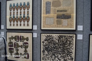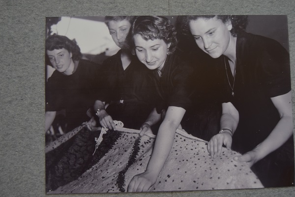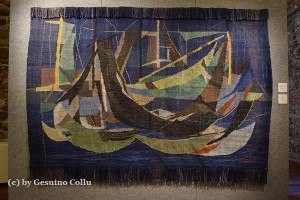 in esposizione bozzetti per foulard, per tappeti,per tessuti, stoffe campionarie e un arazzo in lana annodata di Enrico Paulucci dedicato al tema marinaresco dell’Ormeggio.