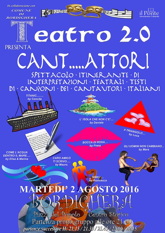 Questa sera a partire dalle ore 21,00, e poi ogni 15 minuti tra i vicoli e piazzette del centro storico di Bordighera, in collaborazione con il Comune si svolgerà lo spettacolo itinerante “CANT…..ATTORI “ ovvero interpretazioni teatrali ispirate a testi di canzoni famose di