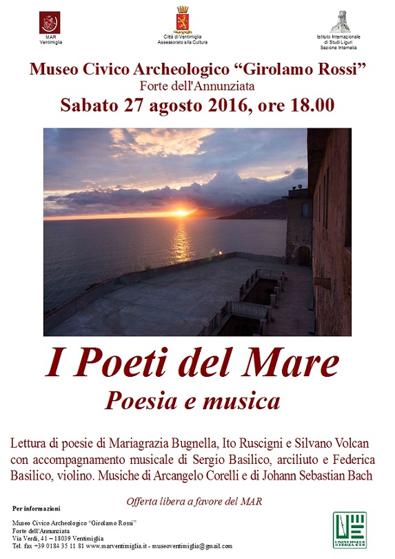 Sabato 27 agosto alle ore 18.00, presso il Museo Civico Archeologico “Girolamo Rossi” Via Verdi n. 41 a Ventimiglia, protagoniste assolute saranno la poesia e la musica, con la lettura di opere di Mariagrazia Bugnella, Ito Ruscigni, Silvano Volcan e l’accompagnamento dal vivo di musiche di Arcangelo Corelli e Johann Sebastian Bach, eseguite da Sergio Basilico, arciliuto, e Federica Basilico, violino. L’incontro è organizzato in collaborazione con l’Assessorato alla Cultura di Ventimiglia, la Sezione Intemelia dell’IISL e l’Unitre Intemelia. Entrata ad offerta libera per il Museo.