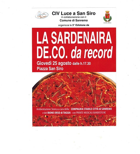 Il programma prevede: saluto delle autorità, intrattenimento musicale della banda “Canta e Sciuscia“, ambientazione storica a cura della Compagnia Stabile Città di Sanremo e del Rione Orso di Taggia, misurazione e distribuzione della sardenaira.