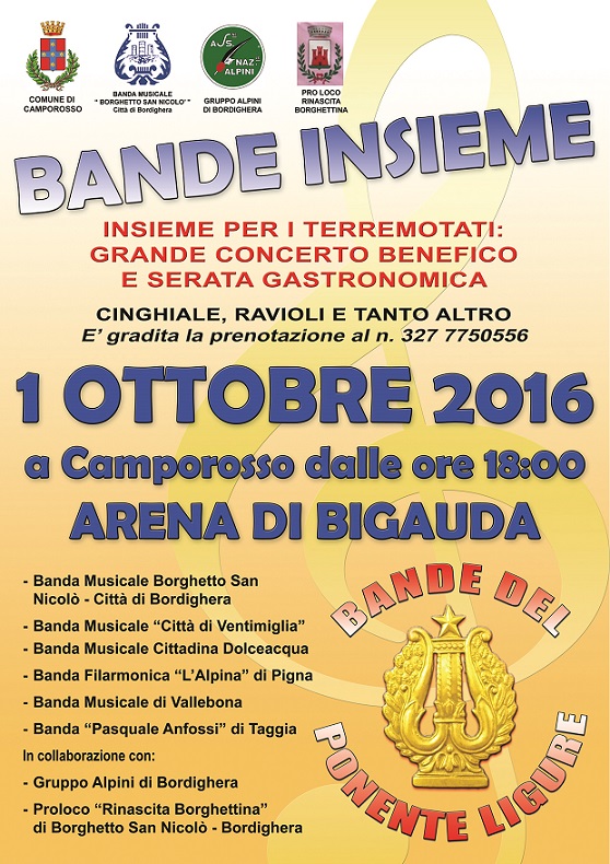 A partire dalle ore 18.00, presso l’Arena di Bigauda a Camporosso, 6 Bande Musicali si esibiranno in concerto con l’obiettivo di raccogliere fondi. La serata continuerà con la possibilità di gustare cinghiale, ravioli e tanto altro grazie alla collaborazione della Proloco “rinascita Borghettina” di Borghetto San Nicolò – Bordighera.