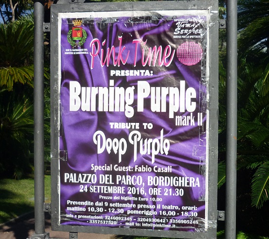 “Pink Time” Associazione culturale organizza nella serata di sabato 24 settembre alle ore 21:00 un tributo ai Deep Purple presso il Palazzo del Parco di Bordighera.