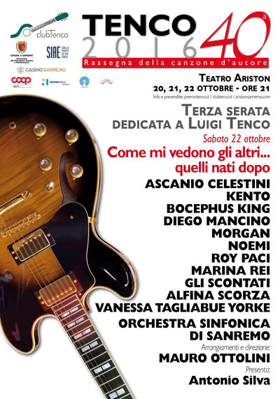Tante le tonalità con cui il Club Tenco ha deciso di dipingere un ritratto del grande cantautore piemontese: si va dall’inventiva musicale di Morgan all’intensità interpretativa di Noemi, dal canto attoriale di Ascanio Celestini all’esuberanza di Roy Paci, dal rap di contenuti di Kento all’anima energica di Marina Rei. E ancora: il suono canadese di Bocephus King, la forza espressiva di Diego Mancino, la creatività de Gli Scontati, la personalità suggestiva di Alfina Scorza sino a una recente scoperta del Club che torna per la quarta volta consecutiva in una manifestazione del “Tenco”: Vanessa Tagliabue Yorke. Ciascun cantante eseguirà due brani di Tenco. Ma non basta: gli artisti saranno accompagnati dall’Orchestra Sinfonica di Sanremo, con gli arrangiamenti, la sezione ritmica e la direzione di Mauro Ottolini, prestigioso musicista jazz aperto ad ogni contaminazione.