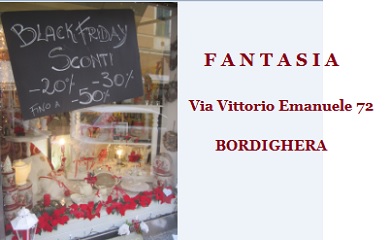 Bordighera News “FANTASIA” ADERISCE ALLA GIORNATA “BLACK FRIDAY” 25 Novembre 201626 Novembre 2016 admin articoli da regalo, Black Friday, Black Friday Bordighera, Bordighera, Fantasia, sconti a Bordighera, Silvia Villa  VENERDI’  25 NOVEMBRE 2016  “BLACK FRIDAY”  A BORDIGHERA Anche il negozio “F A N T A S I A” in via Vittorio Emanuele 72 a Bordighera aderisce alla giornata commerciale denominata “BLACK FRIDAY” con sconti solo per oggi!!! La redazione