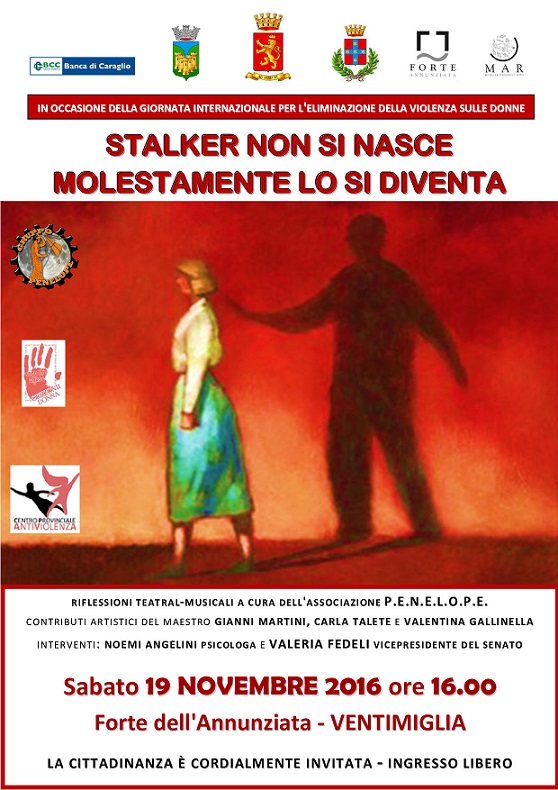 Domani sabato 19 novembre 2016, alle ore 16.00, al Forte dell’Annunziata di Ventimiglia in onore della Giornata Internazionale per l’eliminazione della violenza sulle donne, l’Associazione P.E.N.E.L.O.P.E. – Donne del Ponente per le Pari Opportunità proporrà “STALKER NON SI NASCE, MOLESTAMENTE LO SI DIVENTA”, performance teatral-musicale con i contributi artistici di Carla Talete, Valentina Gallinella e del Maestro Gianni Martini.