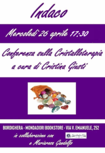Mercoledì 26 aprile, alle ore 17.30, presso il Mondadori Bookstore di Bordighera, nell’ambito della rassegna “Indaco, un viaggio attraverso l’astrologia e la cristalloterapia”, la cristalloterapeuta Cristina Giusti terra’ una conferenza durante la quale parlerà del regno minerale, dell’antica arte di curare con le pietre, della vibrazione dell’energia e delle qualità di ogni pietra trattata