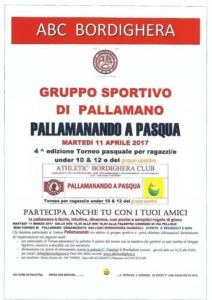 Pallamanando a Pasqua , è il prossimo appuntamento per i giovani atleti iscritti al Gruppo Sportivo di pallamano organizzato dall’ABC Bordighera ma anche a chi vuole avvicinarsi a questo sport per la prima volta.