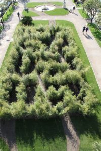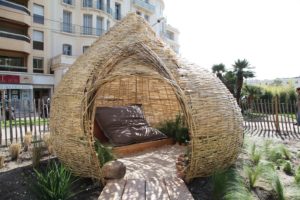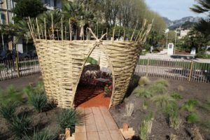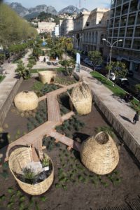 Pour l’emporter, l’équipe a dessiné en plein cœur de ville un jardin éphémère constitué « d’îlots flottants qui invitent le voyageur à un tête-à -tête avec une ambiance, une plante ou une couleur. Dans des cabanes tissées, les sens sont en éveil. On peut s’asseoir, sentir et ressentir les odeurs propres à la Côte d’Azur : sauge, romarin, oranger (…) Chaque cabane offre une pose méditative ». De fait, entre les huttes et la passerelle qui les relie en chevauchant un parterre en friche, lequel bourgeonnera au fil des semaines, on se prend au jeu ; partir à la découverte de mondes distincts qui révèlent, pêle-mêle, des feuillages exubérants, de la terre de pluie, des arômes entêtants, des plantes douces et même des végétaux préhistoriques .