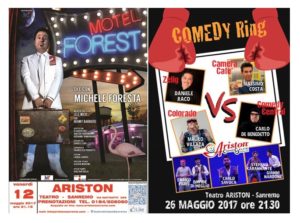 Venerdì 26 maggio alle ore 21.15 è in programma lo spettacolo di cabaret Comedy Ring con alcuni comici di Zelig, Colorado, Camera Cafè e Comedy Central, che si daranno battaglia sul palco a suon di risate e divertimento garantito. Alla serata parteciperanno anche i vincitori della prima edizione di Ariston Comic Selfie il web talent prodotto dal Teatro Ariston. Lo show sarà improntato sull’animazione, dove il vero protagonista sarà il pubblico, che verrà coinvolto, interagendo con gli artisti durante le loro performance.