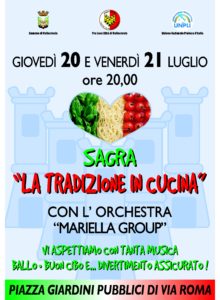 Entrambe le serate saranno in compagnia dell’orchestra “Mariella Group” che a partire dalle ore 21 circa intratterrà il pubblico con grandi successi di liscio, latino americano e anni ‘60-’70 e anni ’80. L’orchestra prende il nome dalla cantante principale, Mariella Vigna, professionista con esperienza trentennale. La Sagra dei prodotti tipici e dei piatti preparati come dai nostri nonni venerdì 21 sarà allietata da un doppio appuntamento: durante la serata, oltre all’Orchestra Mariella Group, è infatti prevista l’esibizione di una quindicina di allievi di danza moderna della Scuola “Il tempo della danza” di Camporosso di Fabiana Caccamo.