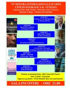 Il Teatro Ariston di Sanremo comunica che in occasione della 74° Mostra internazionale d’arte cinematografica di Venezia, proietterà in streaming  alle ore 21:00 nella Sala incontri, una selezione di film dalle Sezioni: Orizzonti, Fuori Concorso, Biennale College e Cinema nel Giardino