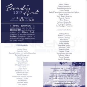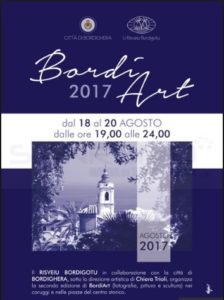 Venerdì 18,sabato 19, domenica 20 agosto Centro Storico, L’Associazione “U Risveiu Burdigotu”, in collaborazione con diversi artisti organizza BordiArt. Esposizione di dipinti, sculture e fotografie nei vicoli e nelle piazzette più suggestive di Bordighera Alta.