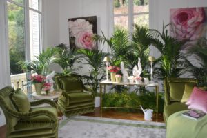JARDIN D’HIVER: il nous rappelle l’espace dédié aux serres dans les grandes habitations du fin XIXème siècle. Une chaise-longue et deux petits fauteuils modèles Caterina en velours citron vert sont immergés dans une nature luxuriante de kentias, capillaires, fougères, un jardin éphémère récréé par Gruppogiardini. Pour compléter l’environnement une petite table avec colonne en bois solide laquée avec des décors en feuille d’or et dessus de table en marbre et la console T108, toujours en marbre, avec une structure en laiton. Partout bouquets de roses anciennes du Vivaio Rose Service de Vintimille. Perroquets, paons et potiches en porcelaine blanche opaque de Ahura de Zanardello. Enfin, accrochés au mur, on peut admirer des grands tableaux close-up intitulés « Roses » conçus par l’artiste peintre Carla Asquini.