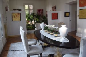 SALLE A MANGER: dans les deux niches, sur des piédestaux en métal doré, deux grands vases Médicéen en porcelaine blanche opaque de Ahura de Zanardello. Au centre de la salle une table ovale avec une base de cristal remarquable et dessus de table en ébène avec un marbre calacatta gaufré et doré, assorti à deux fauteuils têtes de table et six chaises recouvertes en velours beige mélangé d’or, sur les murs des peintures à l’huile et feuille d’or de l’artiste japonaise Yoko Gransagne.