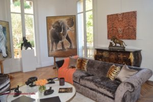 SALON DE CHASSE: les tissus velours matelassés pour le canapé Vénus et les fauteuils Dorotea sont dans différentes nuances de brun. Un environnement domestique reconstruit autour d’une cheminée en marbre avec de grandes toiles d’animaux de la Savane : tigres, lions, éléphants de l’artiste français François Legrand. L’exposition d’art se poursuit avec une commode à collectionner en boulle avec détails en bronze doré, modèle W019; des sculptures en bronze de panthères et de lions fin du XIXème siècle de la Galleria Anticarte. Sur les murs un tissus imprimé “Tigre” des années ’70 de Ken Scott de la Collection “Le Cirque“.