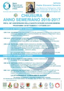 Cultura News Sanremo Sanremo – Chiusura Anno Semeriano 2016 – 2017 29 Settembre 201729 Settembre 2017 admin 150° ANNIVERSARIO DALLA NASCITA DI PADRE SEMERIA I Festeggiamenti si svolgeranno nelle giornate del 30 settembre e 1° ottobre 2017. Clicca e ingrandisci la locandina