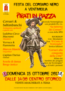 Domenica 15 ottobre 2017 – nel centro storico di Ventimiglia dalle ore 14:30 in poi – si terrà la prima edizione della “Festa del Corsaro Nero”. L’Amministrazione Comunale intende iniziare a celebrare come merita uno dei suoi più illustri cittadini, Emilio di Roccabruna signore di Ventimiglia, conosciuto in tutto il mondo come “Il Corsaro Nero”, un fenomeno planetario, tradotto ed esportato in molti paesi, idolo incontrastato dei bambini di ogni età grazie anche a una serie di utilizzi che vanno oltre la letteratura nata dalla penna di Emilio Salgari.