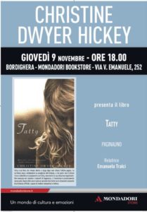 Giovedi 09 novembre, alle ore 18,00 presso il Mondadori Bookstore di Bordighera, verrà  presentato in anteprima nazionale, “Tatty” Edizioni Paginauno, il primo romanzo tradotto in Italiano della nota autrice irlandese Christine Dwyer HickeyTatty, campione di vendite in Irlanda e in Inghilterra, é stato inserito tra le 50 opere irlandesi più importanti degli anni Duemila, candidato al prestigioso Orange Prize e selezionato per il premio Hughes & Hughes come romanzo dell’anno.