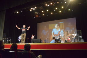 ” La Felicità esiste e va’ condivisa ” e per questo Insinna dialoga con i presenti, interroga su com’è possibile essere felici, nel suo piccolo romanzo ci racconta la storia di Vittorio e Laura, che vanno in Polinesia per trovare la felicità . Per i bambini a scuola il momento di felicità è la ricreazione, quando suona la campanella che interrompe la lezione.Il viaggio di Insinna è lungo circa tre ore e continua con un ritmo incalzante sulle note musicali di ” La vita l’è bela….” e sulla canzone che Alberto Lionello cantava ” La La Lala…”quando dal pubblico si scatenano gli applausi per il Protagonista Flavio Insinna e la sua Piccola Orchestra.