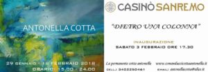 Altre Città Cultura News Sanremo Teatro Casinò Sanremo – L’artista Antonella Cotta espone le sue opere al Casinò 28 Gennaio 201830 Gennaio 2018 admin Antonella Cotta, Casino Sanremo, Dietro una colonna ANTONELLA COTTA PRESENTA LA SUA MOSTRA “DIETRO UNA COLONNA” Dal 29 gennaio al 18 febbraio 2018 presso il Foyer del Casinò di Sanremo si potranno ammirare le opere dell’artista Antonella Cotta. Orario: 15:00 – 24:00 Inaugurazione sabato 3 febbraio 2018 alle ore 17:30