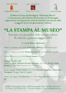 Si apre così il ciclo 2018 delle conferenze realizzate da Miriana Rebaudo, giornalista ventimigliese, che presenta alcune novità, a partire dai nuovi siti che ospiteranno i vari incontri: dal Forte dell’Annunziata alla Biblioteca Aprosiana, dal Teatro alla zona pedonale di via Hanbury. Altra novità, il coinvolgimento dell’Associazione culturale intemelia Controtempo, con il patrocinio del Comune di Ventimiglia e dello stesso Museo Rossi Resta invece immutata la struttura, che vede via via ospiti nomi importanti del giornalismo italiano.