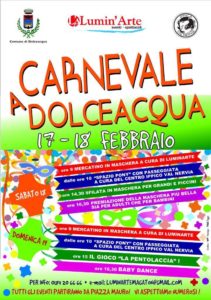 Sarà festeggiato il Carnevale con l’organizzazione cura dell’Ass. Lumin’Arte in collaborazione con il Comune. Per gli innamorati domenica 18 al castello, il servizio guide in collaborazione con l’Enoteca Regionale della Liguria curerà una degustazione dedicata all’amore, con visite guidate che raccontano di storie romantiche in quel di Dolceacqua in occasione della Festa di San Valentino. Sarà allestito un invitante banco di assaggio di vini DOP liguri, bianchi rossi e tante bollicine prodotti nella regione Liguria. Visite guidate a tema alle ore 11.30 – 15.00 – 16.00. Il banco d’assaggio sarà presente per tutta la giornata. Dal castello Doria, oltre a godere di un bel panorama sul paese, la vista spazia dal mare ai monti dell’ alta val Nervia e si potranno visitare al suo interno anche: l’innovativa sala multimediale Doria – Grimaldi, la sala video che racconta la storia del paese in più lingue e la sala “della cultura contadina” della Val Nervia, dedicata alla tradizione di ieri, fortemente sentita ancora oggi a Dolceacqua, che ha come protagonisti il Rossese di Dolceacqua, l’olio da Olive taggiasche e la lavanda.