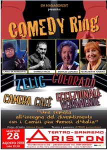 Martedì 28 agosto ore 21.30 torna sul prestigioso palcoscenico del Teatro Ariston di Sanremo lo spettacolo “Comedy Ring” con i comic di Zelig, Colorado, Camera Café e Eccezionale Veramente a darsi battaglia a suon di risate sul palco.