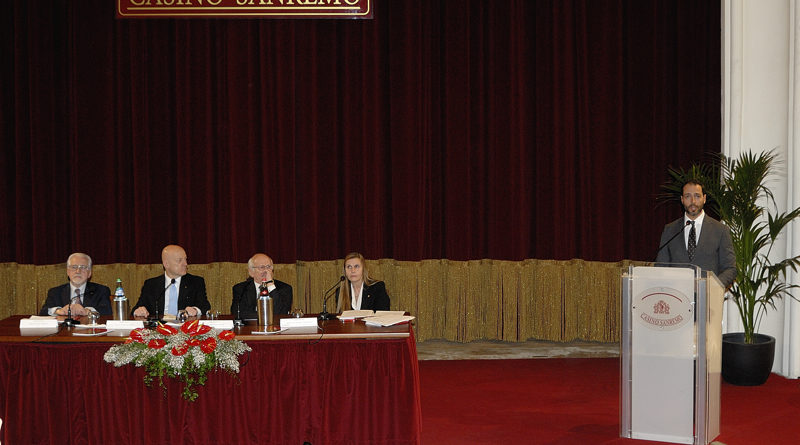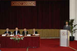 Nella foto il tavolo dei relatori nel primo storico incontro congiunto pubblico tra i Maestri Venerabili avv. Antonio Binni e dott. Stefano Bisi nel Teatro dell’Opera del casinò di Sanremo con il saluto istituzionale del cons. Olmo Romeo, presidente di Federgioco.