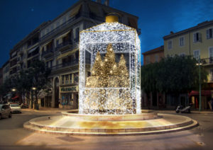 440 motifs de rues, 8 giratoires décorés, effet 3D pour certains et animés en fonction du déplacement des voitures comme celui du Bastion … toit lumineux de 3km équipé de 880 guirlandes et bordé de 72 totems. Carrousel en entrée d’autoroute de 12 m de haut et 10 m de diamètre, lanterne géante érigée place Saint-Roch, une quinzaine de chimères sculptées rue Loredan-Larchey…(