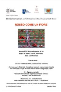 – oggi (martedì 20 novembre), ore 16.30, Forte di Santa Tecla, Sanremo: incontro dal titolo “Rosso come un fiore”. Interverranno il Vicesindaco Costanza Pireri, la Consigliera di Parità Regionale dott.ssa Laura Amoretti e l’avv. Agata Armanetti. Moderatrice avv. Ersilia Ferrante, Vicepresidente del Club per l’Unesco di Sanremo. Evento organizzato dal Club per l’Unesco di Sanremo