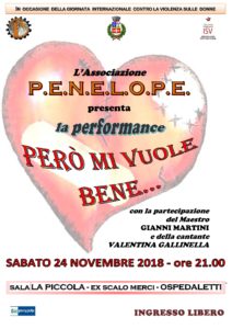 – sabato 24 novembre, ore 21, presso LA PICCOLA (ex scalo merci) di Ospedaletti: nell’ambito delle iniziative organizzate dal Comune di Ospedaletti, l’Associazione P.E.N.E.L.O.P.E.- Donne del Ponente per le Pari Opportunità, propone “PERÒ MI VUOLE BENE. . .” con la partecipazione del maestro Gianni Martini e della cantante Valentina Gallinella