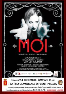 – venerdì 14 dicembre, ore 21, al Teatro Comunale di Ventimiglia “MOI” spettacolo teatrale sulla tragica vicenda della scultrice Camille Claudelle, scritto da Chiara Pasetti e interpretato dalla nota attrice Lisa Galantini. Evento organizzato dall’associazione PENELOPE, promosso dall’Assessorato alle Pari Opportunità di Ventimiglia ed inserito nel calendario ufficiale della stagione teatrale di Ventimiglia.