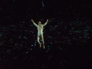 Brachetti accompagnato solo dalla sua ombra ( Kevin Michael Moore),che lo rimprovera dicendogli di smettere di sognare, non essendo più bambino, ci apre le porte delle stanze della casetta in miniatura. E vediamo apparire la soffitta, la cameretta, il bagno, la cucina, il giardino, scoprendo in parte la storia della vita privata e artistica di Arturo, trasformista d’eccezione. I personaggi che porta in scena sono oltre cinquanta attraverso l’arte della chapeaugraphie, i personaggi della televisione, delle fiabe per la gioia dei bambini in sala, i miti della musica internazionale come Madonna, un attimo e il cambio d’abito è fatto. Non potevano mancare le ombre cinesi, il mimo, l’immaginazione che parte da un granello di sabbia con il sand paiting, le mani magiche di Brachetti ottengono effetti poetici ed un omaggio alla città di Sanremo.Un momento musicale piacevole quello dedicato alla mamma, che confezionava abiti, in particolare “ l’abito azzurro” che danza con Arturo. Lo spettacolo è fantastico, scintillante e magnetico cattura il pubblico in un vortice di effetti speciali con un raggio laser e il sipario cala, mentre il clima di entusiasmo cresce per omaggiare uno degli artisti italiani più amato nel mondo.
