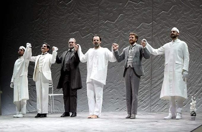 La scenografia appare nuda,dominante è il bianco, anche il protagonista indossa la camicia di forza bianca, nessun colore appare agli occhi del pubblico, nessun colore che ci ricorda i quadri dipinti da Vincent Van Gogh, che afferma “ i colori ti entrano negli occhi ed escono dalla punta del pennello….”. Si ode una voce fuoricampo e lentamente il protagonista si solleva da terra al sopraggiungere del fratello Theo,al quale Vincent chiede : “ Portami via da qui!”