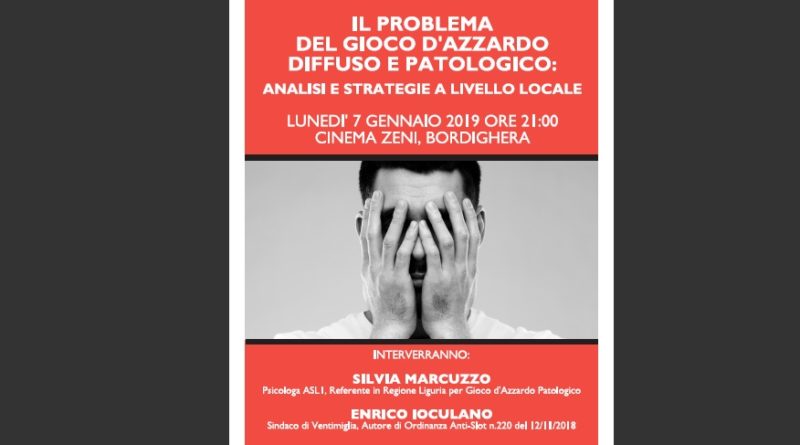 Per conoscere meglio i problemi che nascono dal gioco d’azzardo e facilitare la pianificazione su come contrastarli, il Movimento di Civicamente Bordighera ospitera’ il Lunedi 7 Gennaio alle ore 21 al Cinema Zeni un incontro intitolato “Il Problema del Gioco d’Azzardo Diffuso e Patologico: Analisi e Strategie a Livello Locale”.