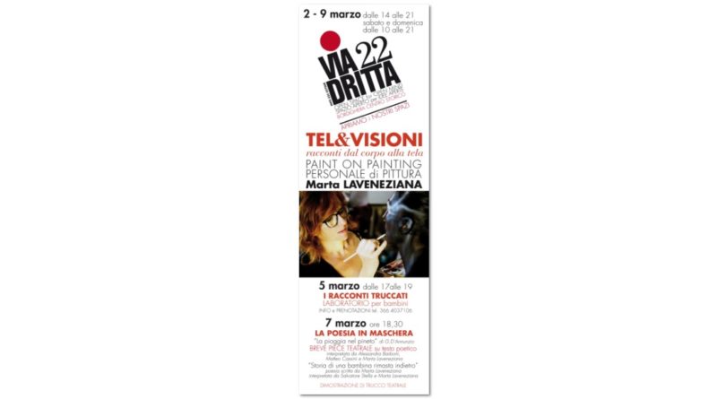 Note BiograficheMARTA LAVENEZIANA Diplomata all’Istituto Statale d’Arte in arte applicata e decorazione pittorica nel 1997, porta avanti per alcuni anni una società propria di decorazione di interni ed esterni specializzata in trompe d’oeil. Attualmente docente di decorazione all’Accademia di Belle Arti di Sanremo. Qualificata body e face painterall’accademia di trucco Makiland di Torino (trucco base , effetti speciali, aerografo)E’stata truccatrice per il gruppo M.A.D.E. ed è entrata a far parte del Manifesto Rabarama Skin Art. Body painter alla VFNO 2015 Firenze. Il body painting unito alla performing art diventa una delle sue forme comunicative piu richieste ed amate. Incrementa la sua formazione con corsi diteatro e stage con attori professionisti presso la compagnia del Banchéro. Consolidata esperienza nell’intrattenimento e teatro di strada acquisita nella lunga collaborazione con il Teatro dei Mille Colori come scenografa, costumista, trampoliera, attrice e autrice. Scrive e illustra poesie e brevi racconti. Espone opere, crea installazioni di body painting e performancein diverse location ed eventi ultimamente ha inaugurato Face art Mostra di arte contemporanea(Forte di Santa Tecla Sanremo). Attualmente impegnata nell’insegnamento del teatro e delle tecniche pittoriche, nella creazione di spettacoli, eventi d’arte e a breve nella sua personale di pittura TEL&VISIONI racconti dal corpo alla tela.