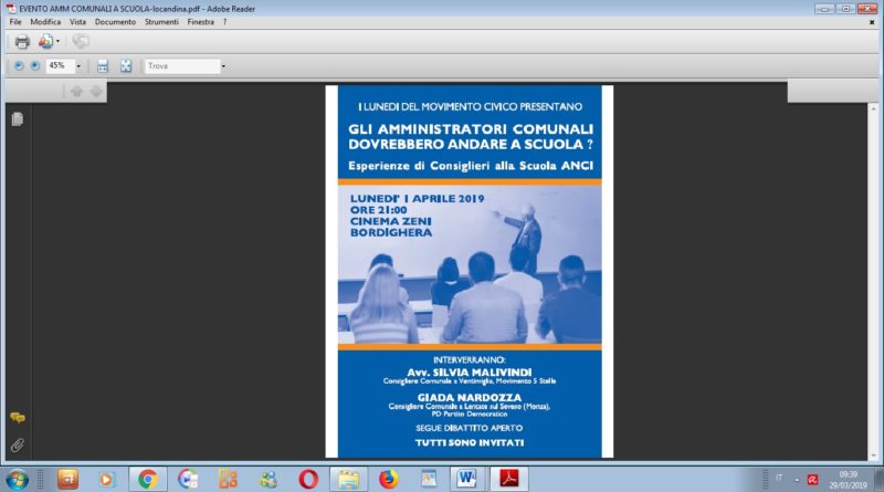 I Lunedi del Movimento Civico a Bordighera ospiteranno il prossimo lunedi 1 Aprile 2019 un incontro dedicato ad una domanda che ci siamo tutti posti almeno una volta: “GLI AMMINISTRATORI COMUNALI DOVREBBERO ANDARE A SCUOLA?” Sembra quasi paradossale che ci si prepari ai ruoli e responsabilita’ lavorative della vita privata con studio e/o tirocinio spesso intensivi e prolungati, mentre per prendere decisioni che impattano la vita di tante persone, spendono risorse ingenti, e ipotecano il futuro di intere comunita’ basti essere eletti, e sulla base di programmi senza requisiti formali mirati ad assicurare sostenibilita’.